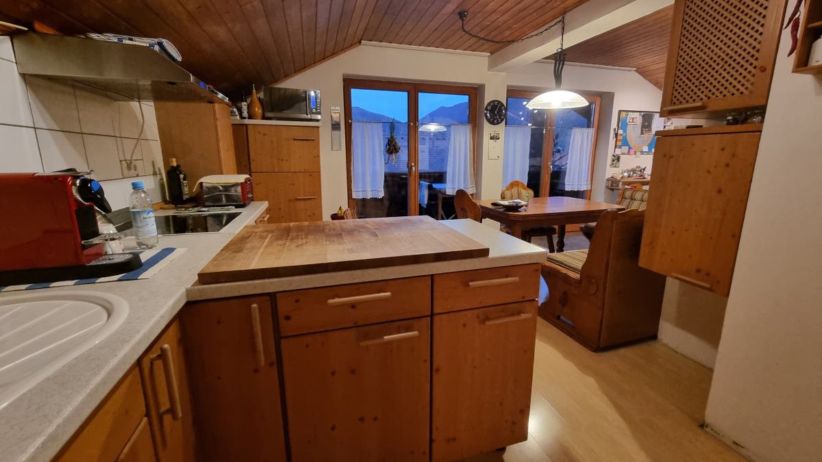 Diese Dachgeschosswohnung mit einer Wohnfläche von 100,7 m² weist einen durchdachten Grundriss auf. Das Wohn- und Esszimmer ist mit der offenen Küche verbunden. Von hier gelangen Sie auf den Balkon und können schon bei Morgensonne den Bergblick genießen.