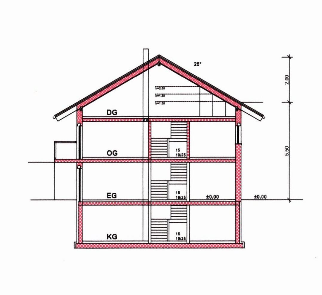 Eine Länge von 12 Meter bei 8 Meter Breite lassen eine großzügige Raumplanung zu. Die Wandhöhe von 5,5 Meter ergibt zwei Vollgeschosse. Aufgrund der Dachneigung von 25 ° kann auch ein Ausbau des Dachgeschosses in Erwägung gezogen werden.