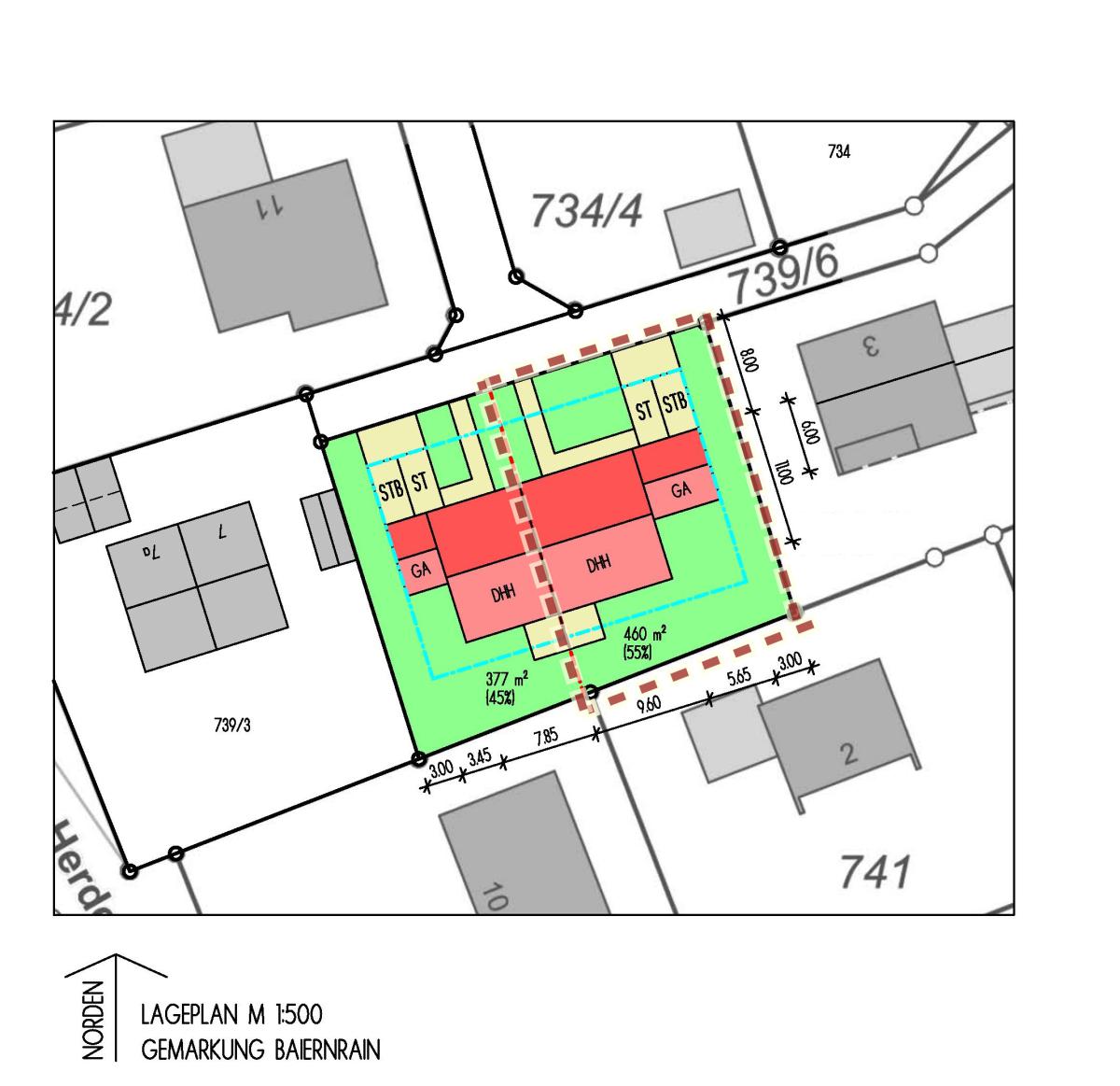 Dieses ebene Grundstück mit der Bezeichnung 739/4 ist derzeit noch mit einem Altbestand bebaut. Bis zu Baubeginn ist die Beseitigung zugesagt.