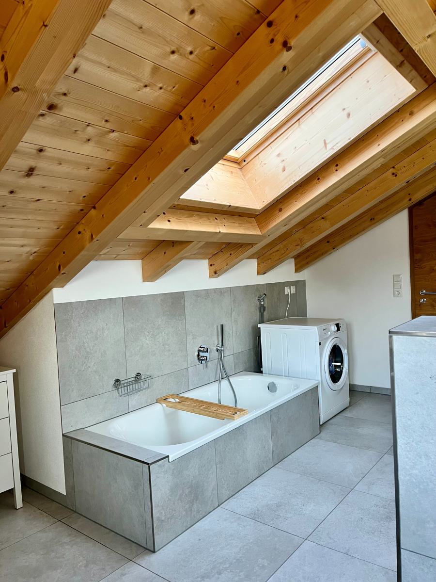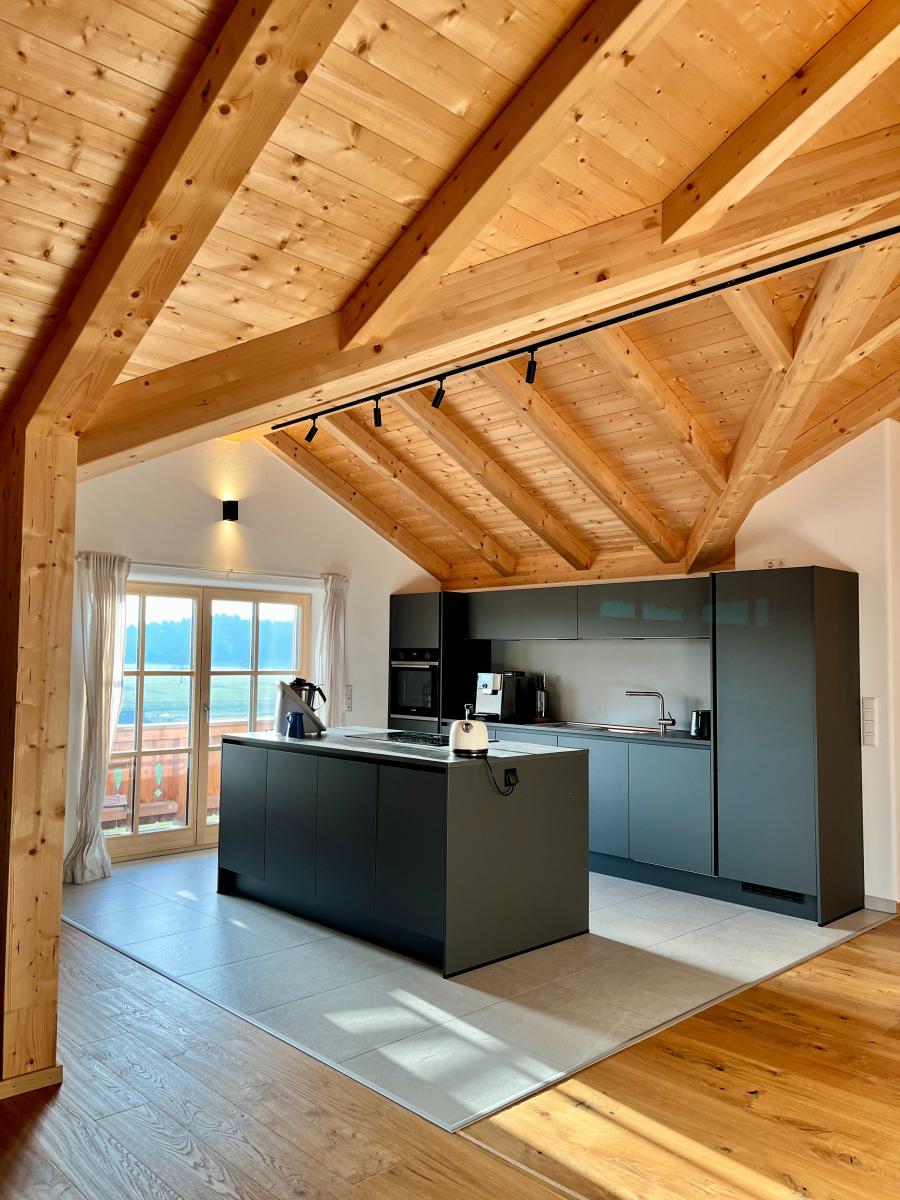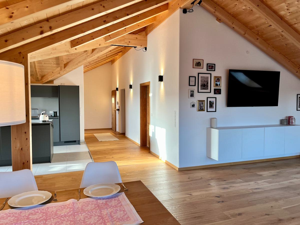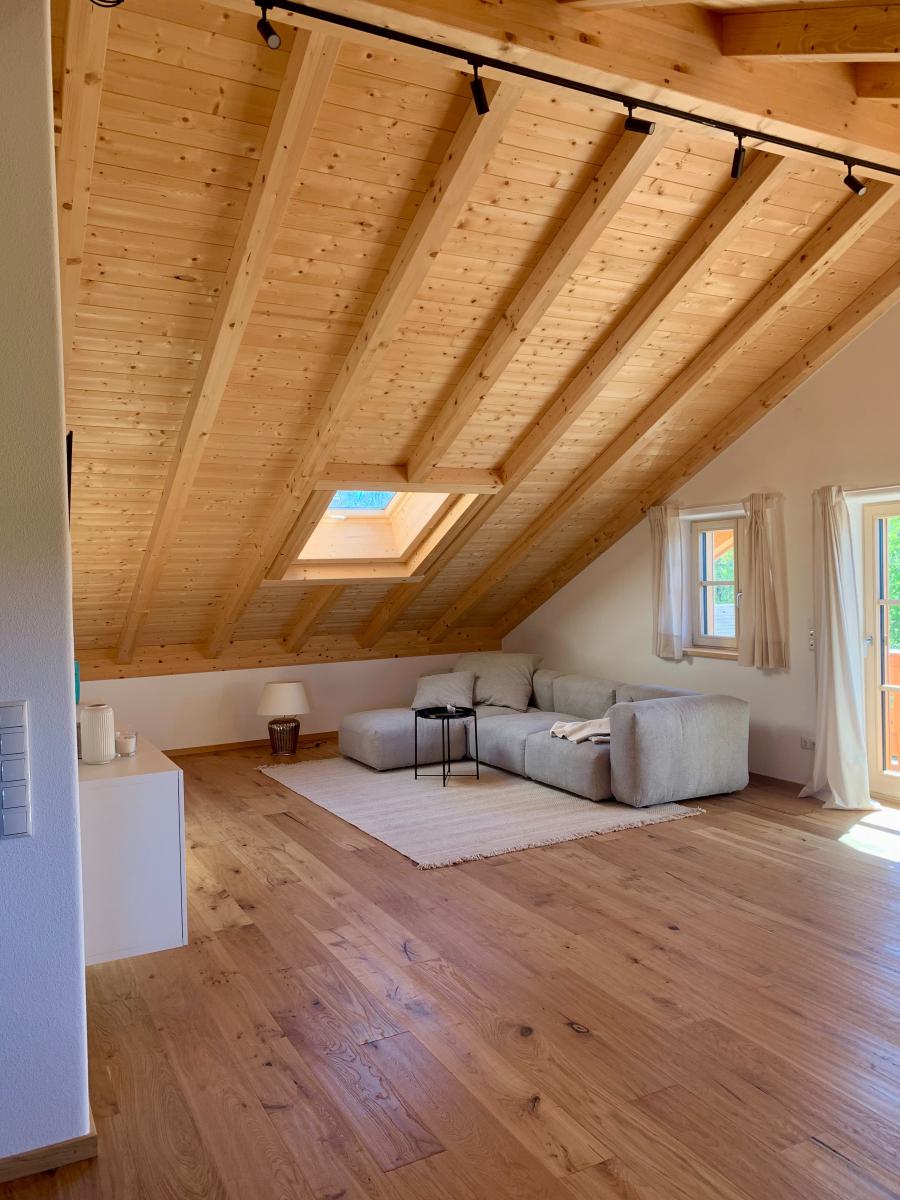 Die großzügige Wohnung verfügt über ein Schlafzimmer, zwei Badezimmer und zwei Balkone. Vom südlichen Balkon genießen Sie einen wunderbaren Ausblick bis in die Berge während der Westliche einen beruhigenden Blick über Wiesen bis zum Wald bietet. Die zentrale Heizung sorgt für wohlige Wärme in allen Räumlichkeiten. Insgesamt gibt es zwei Zimmer, die großzügig geschnitten und lichtdurchflutet sind. Der Sichtholz Dachstuhl bietet Gemütlichkeit ohne drückend zu wirken. Die moderne und hochwertige Ausstattung lässt keine Wünsche offen und lädt zum Entspannen und Wohlfühlen ein.
